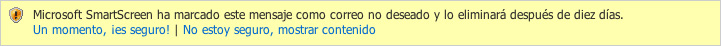Si tu correo electrónico pertenece a cuentas públicas y sin costo como por ejemplo: Yahoo, Gmail o Hotmail, entre otros, puede ser que el e-mail que contiene tu factura electrónica llegue a la bandeja de correo no deseado, en ese caso te aparecerá una leyenda como esta en la parte superior del e-mail: